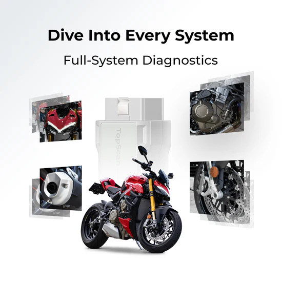 TopScan Moto, motor, ABS, akıllı anahtar, eğlence sistemleri ve daha fazlasını kapsayacak şekilde 20’den fazla dahili sistemde tam sistem teşhis sunar. Bu yaklaşım, daha doğru ve hızlı sorun giderme sağlar.